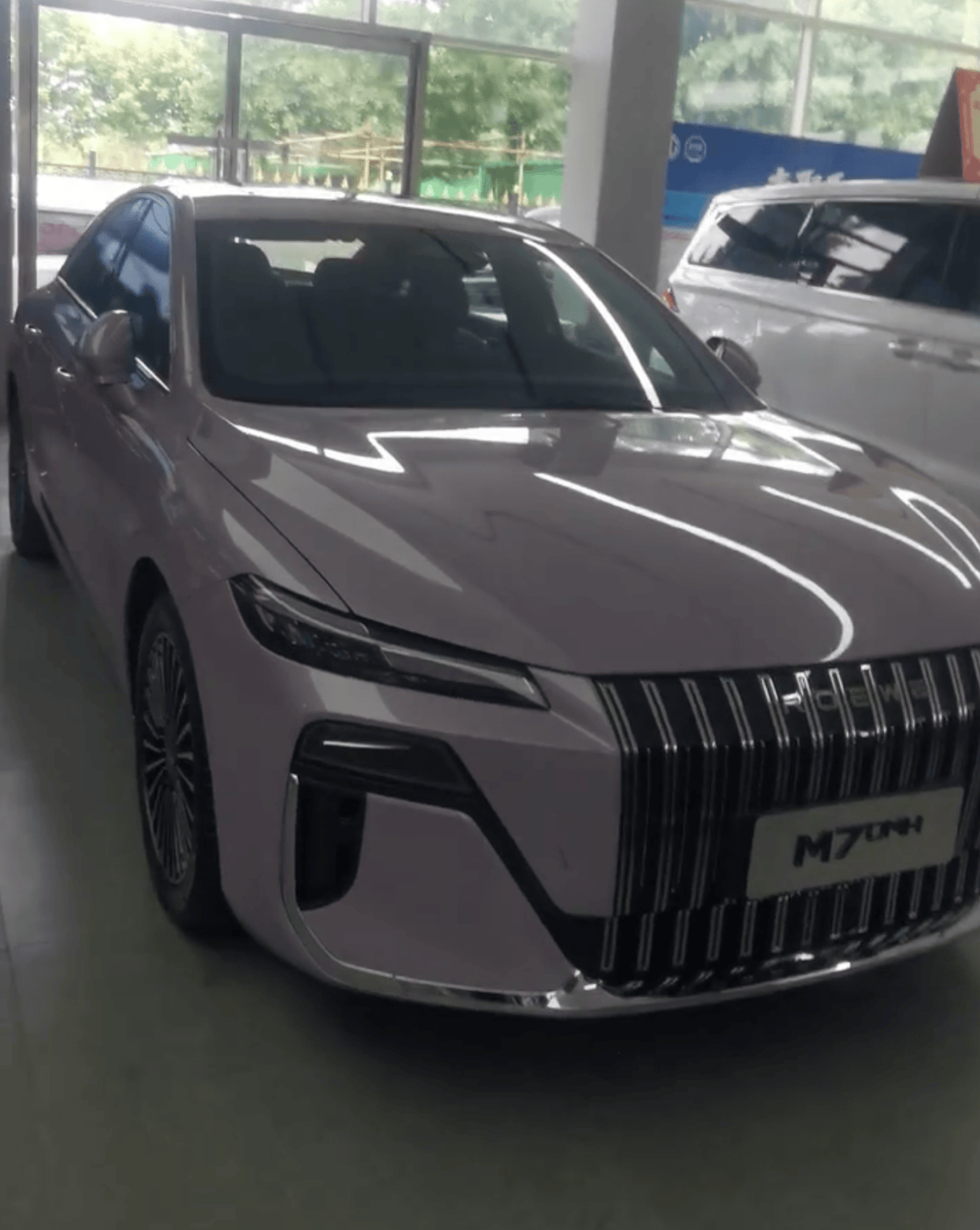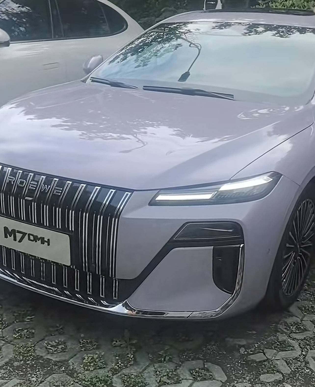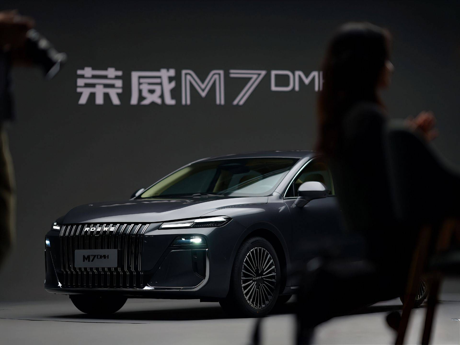 从实车图来看,荣威M7 DMH并没有采用家族化的封闭式前脸,而是配备与劳斯莱斯类似的大面积直瀑式进气格栅,加之两侧狭长的矢量光轨晶钻日行灯,甚至还给人一种的既视感。下方远近灯组与导风槽相连形成“7”字形轮廓,并向内延伸出熏黑饰条与格栅相连,又呈现出“微笑”前脸。而外侧贯通式的镀铬饰条点缀,继续强调豪华气息,“ROEWE”发光logo则带来了科技感。